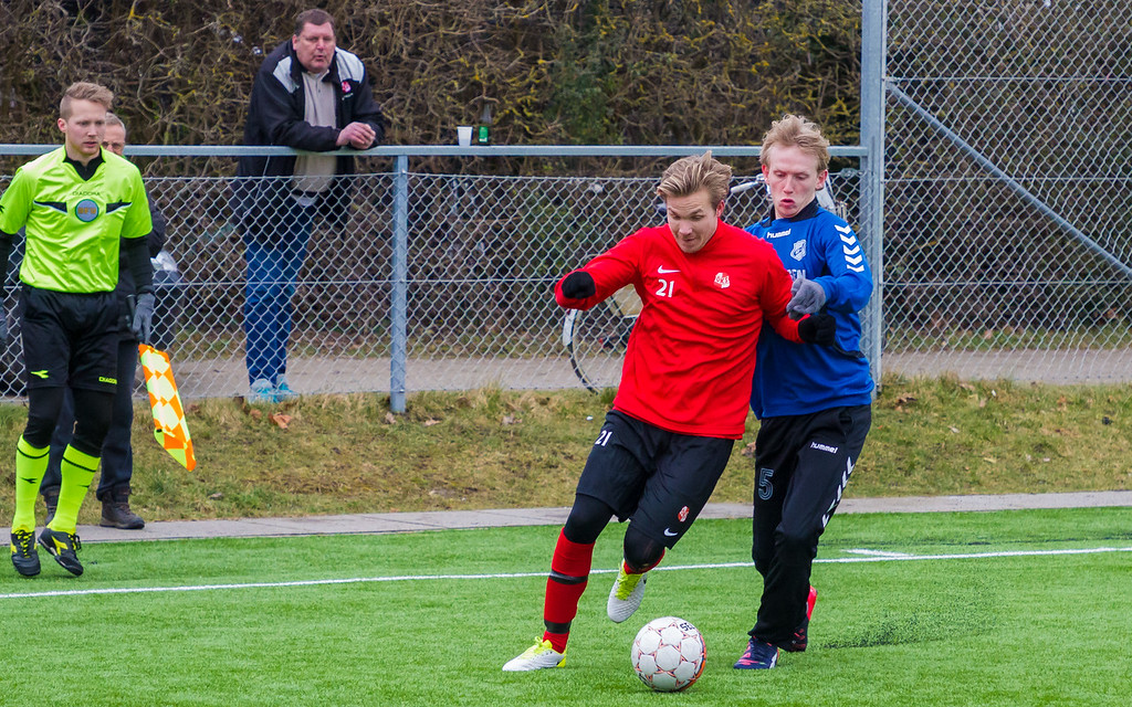 Halvlegens eneste scoring kom, da Jeppe Algaard spillede en lang tværpasning til Jakob Mønster, der fikst driblede sig fri og derefter serverede bolden for en total fri Algaard, der var løbet med i feltet.